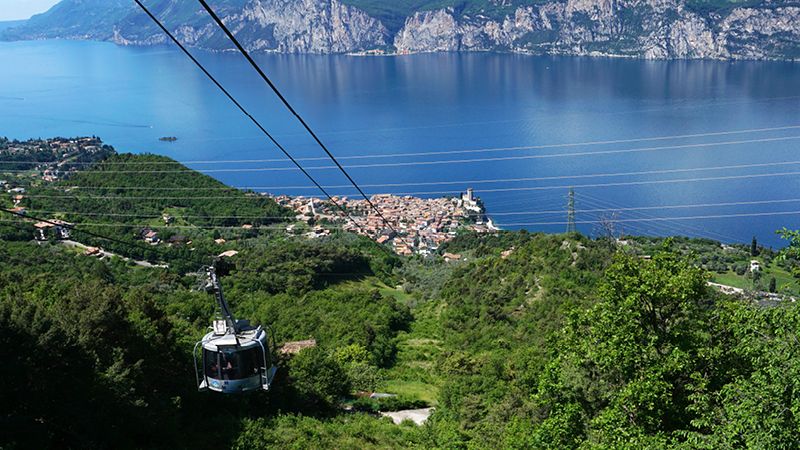 Så snart kabinevognen påbegynder sin færd, ser vi, hvordan byen Malcesine langsomt bliver mindre og mindre. Vi ser den majestætiske middelalderborg Castello Scaligero våge over byen med de smalle stræder, som snor sig gennem den gamle bydel. Højere oppe åbner der sig en vidtstrakt panoramaudsigt over Gardasøen. Vandet glitrer i solen og skifter i nuancer af blåt og grønt, mens bjergene, der omgiver søen, rejser sig dramatisk mod himlen. Søens kystlinje er prikket med små byer og havne, og på en klar dag kan vi måske ovenikøbet se hele vejen til Sirmione, der stikker ud som en smal odde på søens sydlige side.