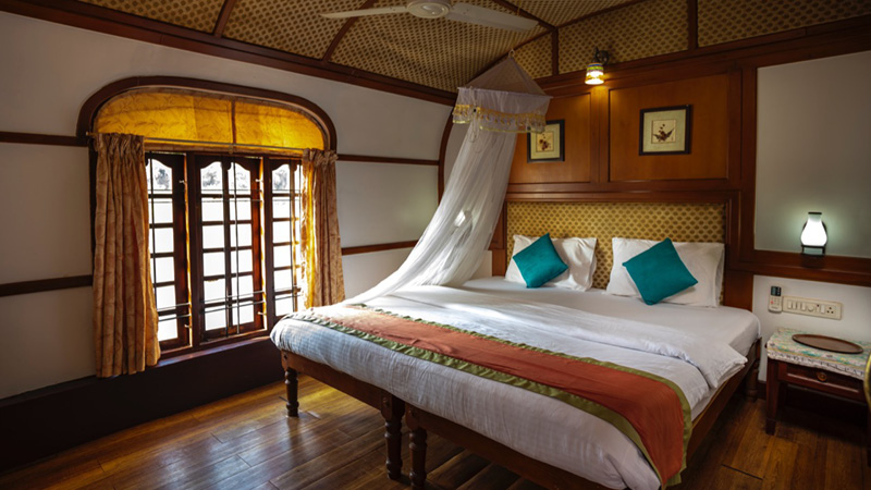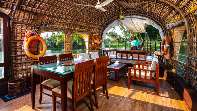 En stor del af oplevelsen er den autentiske mad, der serveres ombord. Menuen byder på friskkogt ris, krydrede karryretter lavet med lokale økologiske grøntsager, den berømte Pearl Spot (Karimeen) fisk, tapioka og fiskecurry.