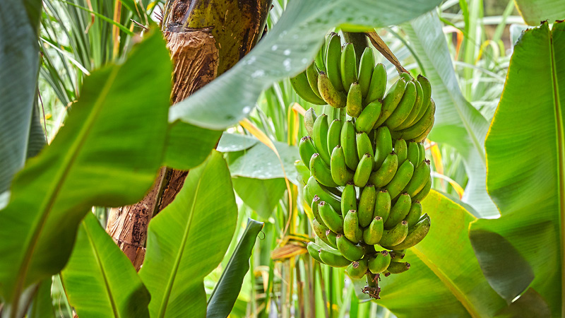 Næste stop på turen er i en banan-plantage i området ved Madalena Do Mar. Vi går en tur gennem det grønne landskab, hvor vi får meget mere at vide om produktionen af en af en af Madeiras vigtigste afgrøder, bananen. Den vokser på en trælignende palme, men er faktisk en urt med en han- og en hunblomst. Madeira-bananerne er sødere i smagen og en smule mindre end, hvad vi er vant til.