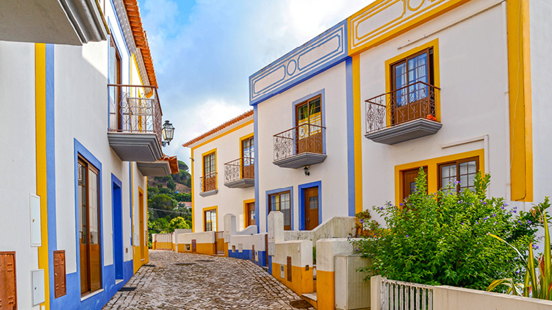 Billede: Algarves karakteristiske farvede huse og udsigt ved stranden Bordeira.