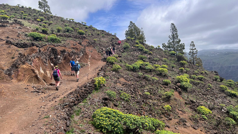 Stien snor sig gennem et spektakulært terræn af grønne dale og dramatiske klipper. Vi ser mosaikken af terrasserede landskaber, hvor lokale landmænd dyrker deres afgrøder, og kommer også igennem UNESCO-beskyttede Garajonay Nationalpark, hvor laurbærskovene dækker mange af øens højere områder. Her kan vi puste ud under de tætte trækroner og nyde den rene, friske luft.