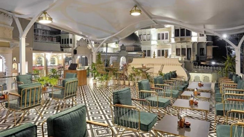 Måltiderne indtages på hotellets restaurant Cinnamon, der har udsigt over poolen og på tagterrassen finder man baren Stallion med en fantastisk udsigt over Swaroop Sagar-søen.