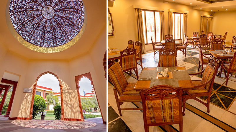 I den stemningsfulde restaurant Charbagh serveres lokale specialiteter som Rajasthani kebab og grillretter, mens Sir P tilbyder udvalgte retter fra både det indiske og internationale køkken. I hotellets bar, Amrit Sagar, kan man slappe af med en cocktail og en omgang billard.