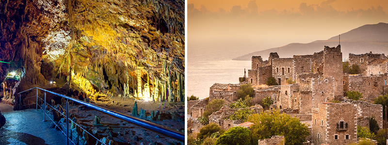 Vi gør holdt i flere idylliske kystlandsbyer og frokosten kan man spise i Manis hovedby Aerópolis hvor der er flere gode restauranter. Petros Mavromichalis fra Aerópolis startede opstanden mod tyrkerne (Osmanerne), og deres besættelse, og startede dermed uafhængighedskrigen. På det centrale torv kan du se en statue af samme.