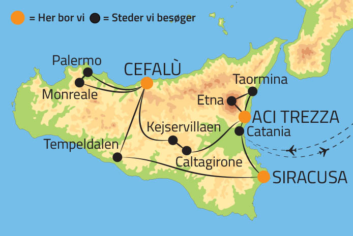 Vi lander ved Siciliens hovedstad Palermo hvorefter vi har en kortkørsel ud til den mondæne badeby Mondello hvor vi skal bo på rundrejsens første del. Afhængig af ankomsttidspunkt kan der forekomme ventetid på at få værelserne.